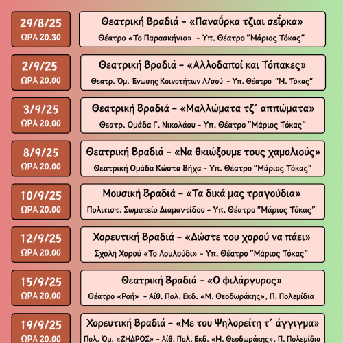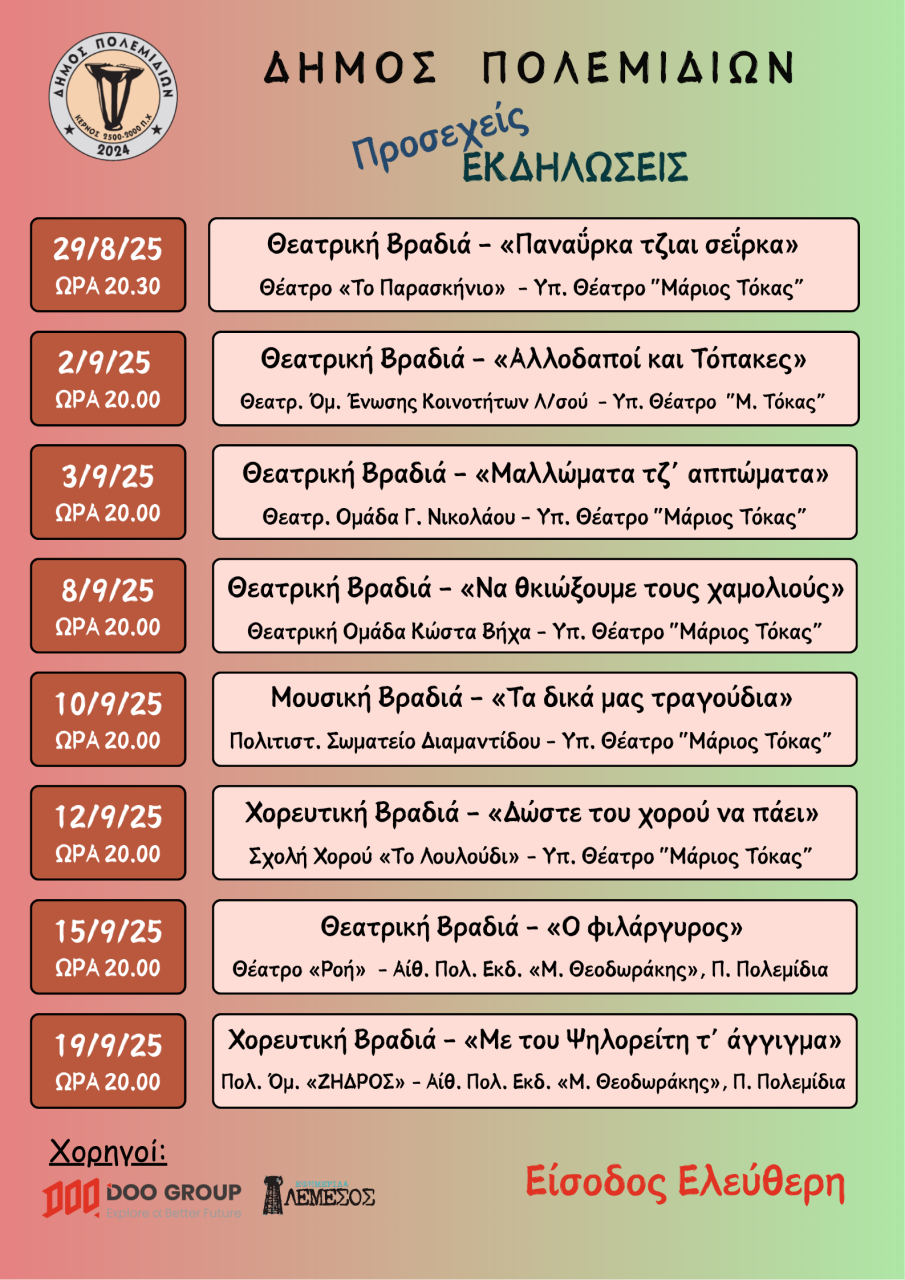 ΠΡΟΣΕΧΕΙΣ ΠΟΛΙΤΙΣΤΙΚΕΣ ΕΚΔΗΛΩΣΕΙΣ ΔΗΜΟΥ ΠΟΛΕΜΙΔΙΩΝ - ΑΝΑΝΕΩΜΕΝΟ ΠΡΟΓΡΑΜΜΑ ΠΟΛΙΤΙΣΤΙΚΟΥ ΚΑΛΟΚΑΙΡΙΟΥ 2025